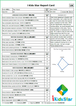 - お子さまの成長を保護者のみなさまとともに喜び、さらなる成長をともに支えることを目的に、それぞれの学年ごとに全園児の習熟度を個別に年2回測定し、『iKS Report Card(成績通知表)』としてご家庭にお渡しいたします。